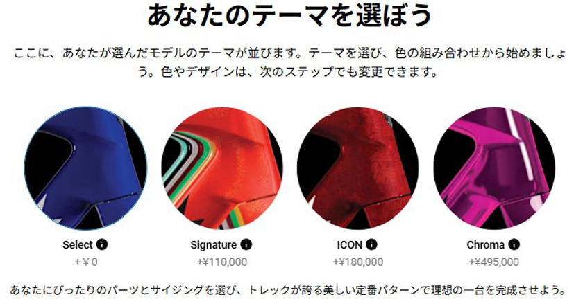 これは単に色を選ぶだけでなく、世界でただ一台、あなただけのバイクを創造するサービスです。プロレーサーと同じように、あなたがフレームのカラー、デザインパターン、そして仕上げのディテールを細部にわたって決定できます。