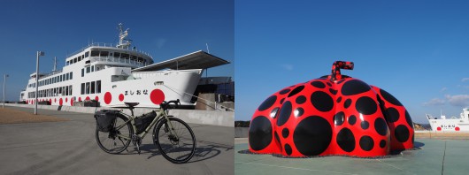 直島の宮浦港ではあの有名な『赤かぼちゃ』のオブジェが出迎えてくれます。乗船したフェリーも『赤かぼちゃ』のように赤い水玉模様がデザインされていました。ロードバイクレースでいうところの山岳賞ジャージ(マイヨ・ブラン・ア・ポワ・ルージュ)みたいですね。