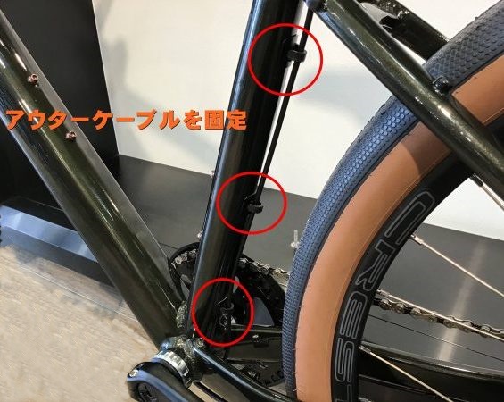 ボトムブラケットから出るケーブルはシートチューブに這わせるように固定しています。