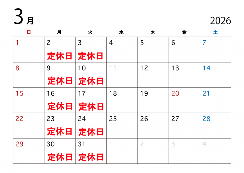 3月の定休日のお知らせです。